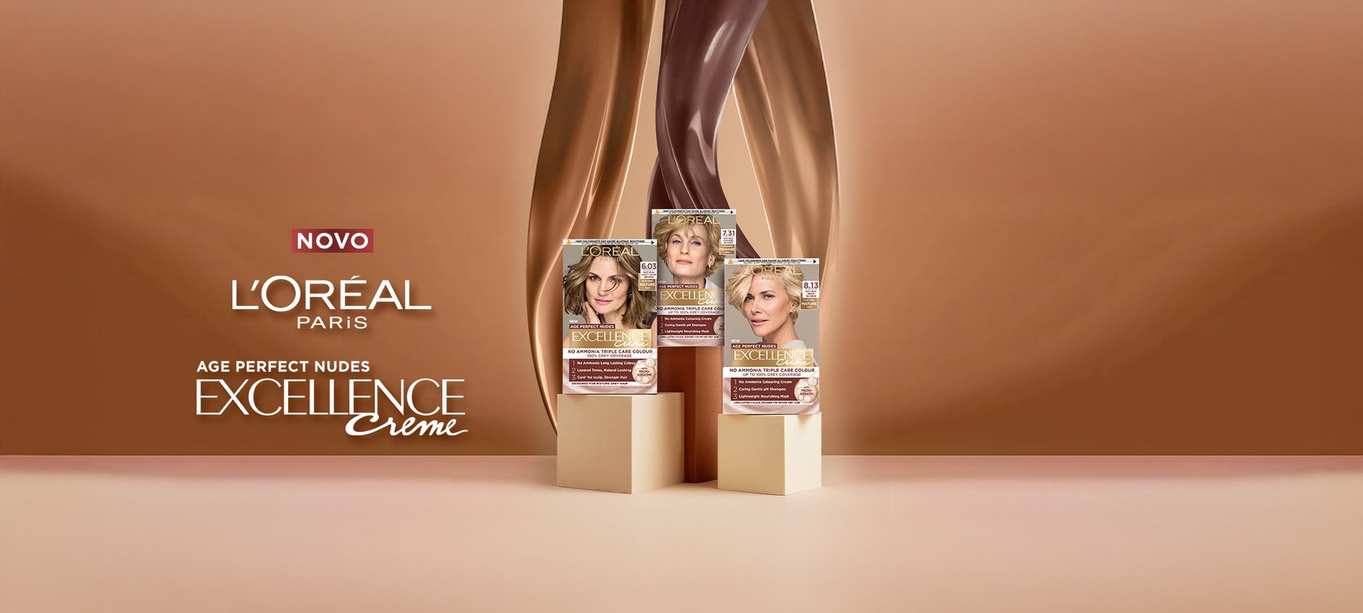 Za zrele lase idealna barva za lase zagotavlja 100-odstotno prekrivanje sivih las z ritualom, ki je nežen do las in lasišča. Barva za lase L'Oréal Paris Excellence Crème Age Perfect Nudes je brez amoniaka* in je posebej zasnovana za zrele sive lase. Ponuja formulo s trojno nego, ki skrbi za vašo barvo, lasišče in lase ter zagotavlja naraven videz z večplastnimi toni, ki laskajo zreli polti.